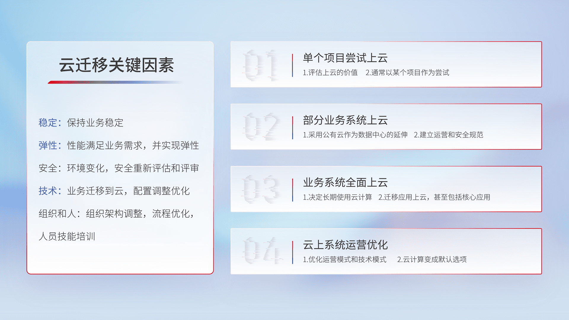 结合实际业务,,,从规划设计、、云平台选型、、、云原生改造、、、、数据迁移、、、、集成交付,,,迁移全过程为客户识别最佳上云路径,,,做好风险识别管理,,设计网络架构、、、、身份权限、、安全审计合规、、操作审计、、、日志审计、、监控告警策略、、、多站点容灾设计等,,对云上基础设施进行整体规划,,提升IT治理水平,,,以满足弹性、、高可用、、、、高性能的需求。。