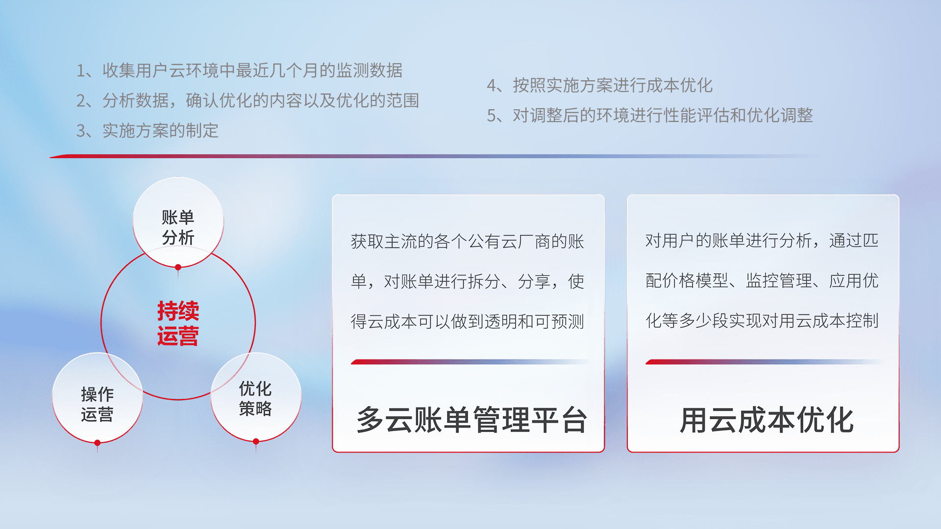 通过多云纳管,,,以统一的资源数据模型把客户的云资源进行抽象和封装,,进而实现对多云资源的统一操作,,,,保障云资源管理的可靠性、、、稳定性与可用性。。。量身定制化运维内容,,,,配置、、、开发运维、、、补丁管理、、、、备份、、、、监控、、、、认证和访问管理、、、、审计和日常巡检等,,保障在用云过程中的可靠度,,,稳定度以及高可用率。。。
